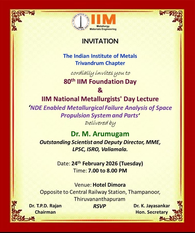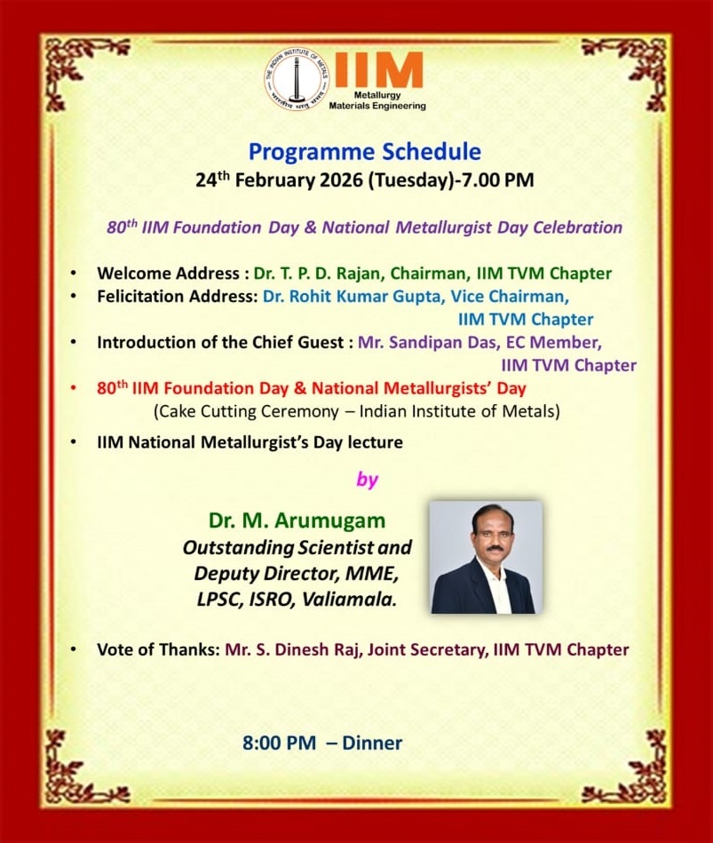 "80th IIM Foundation Day and IIM National Metallurgists’ Day Lecture on Tuesday, 24th February 2026, from 7:00 PM onwards at Hotel Dimora, Trivandrum"